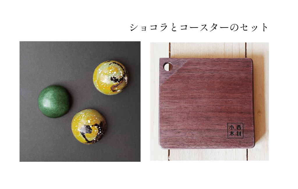ウッドコースターにお酒をのせて、ボンボンショコラを召し上がりながら、心地よいひとときを。お酒が苦手な方は、寿珈琲の香り豊かな珈琲とともにショコラをお召し上がりください。