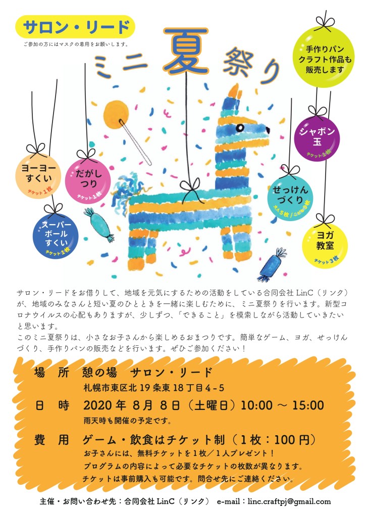 地域のみなさんと短い夏のひとときを一緒に楽しむために、ミニ夏祭りを行います。新型コ ロナウイルスの心配もありますが、少しずつ、「できること」を模索しながら活動していきたい と思います。 このミニ夏祭りは、小さなお子さんから楽しめるおまつりです。簡単なゲーム、ヨガ、せっけん づくり、手作りパンの販売などを行います。ぜひご参加ください!